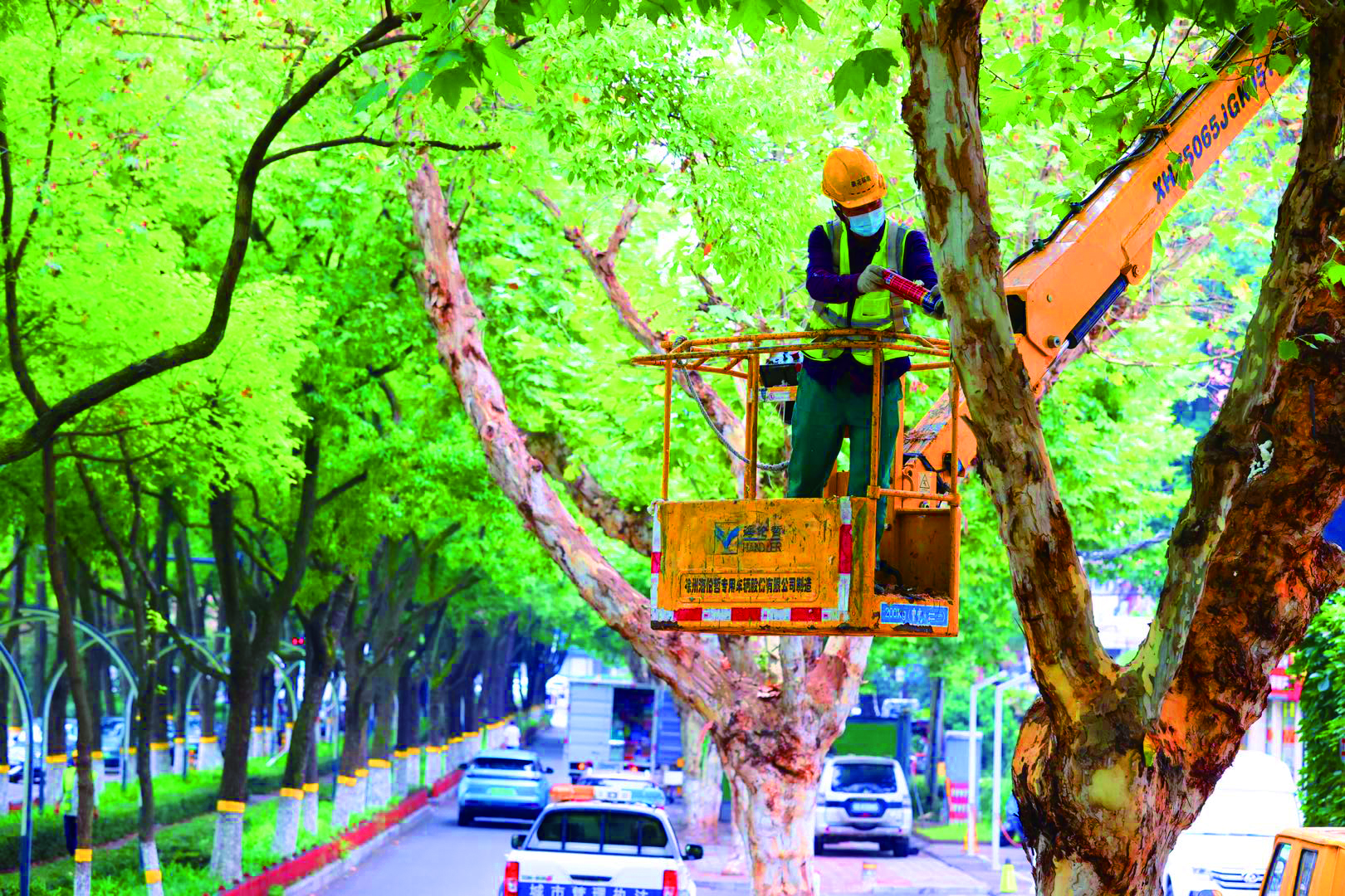 为减少梅雨极端天气的影响,西陵区园林部门提前对辖区主次干道行道树进行汛前“体检”,排查隐患,目前已排查20余条道路,修剪、加固170余棵乔木。图为6月27日,园林养护工人对城区夷陵广场路段行道树上的虫洞进行技术处理。