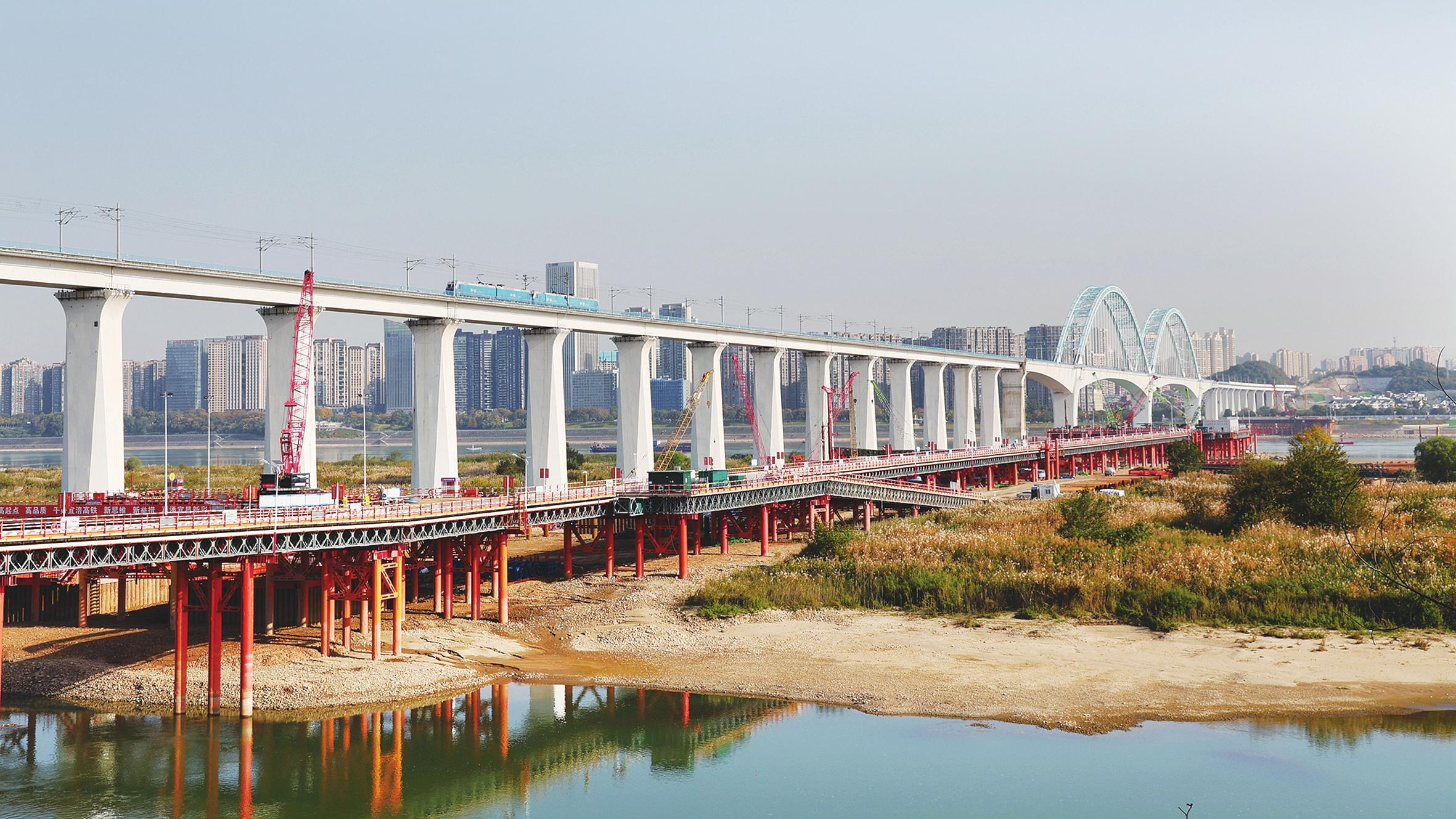 11月27日,建设中的宜昌长江公铁大桥一角。