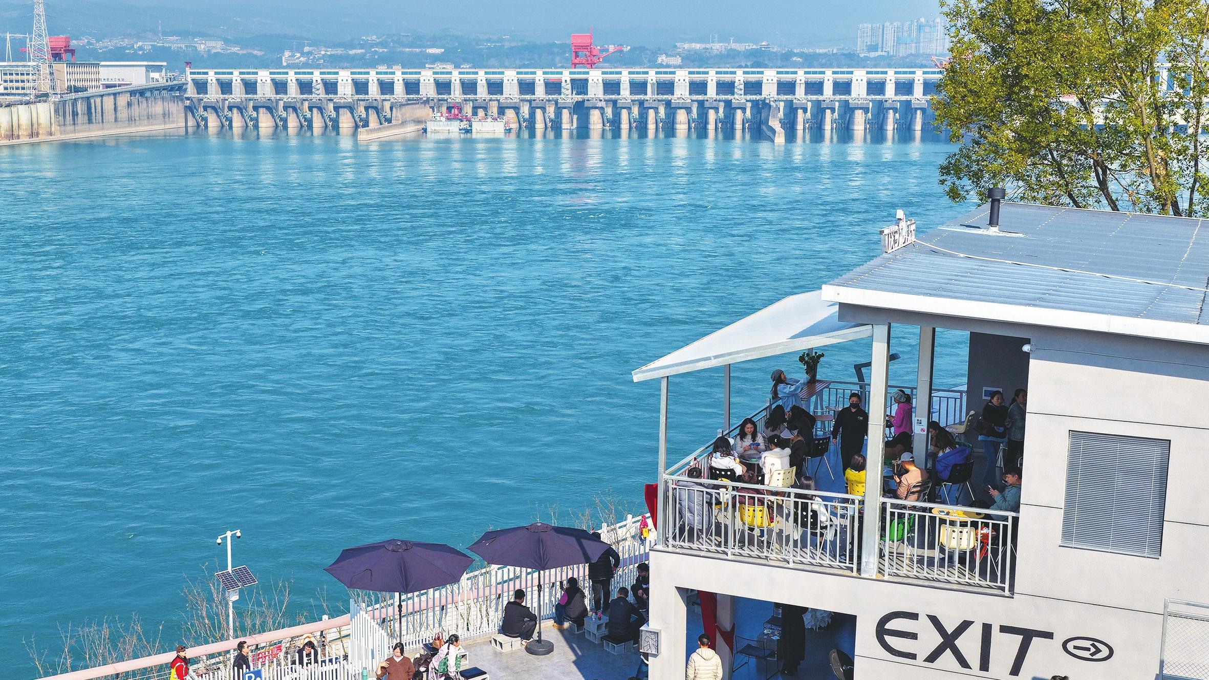 1月15日,市民在西坝临近葛洲坝水利枢纽的网红打卡点游玩。