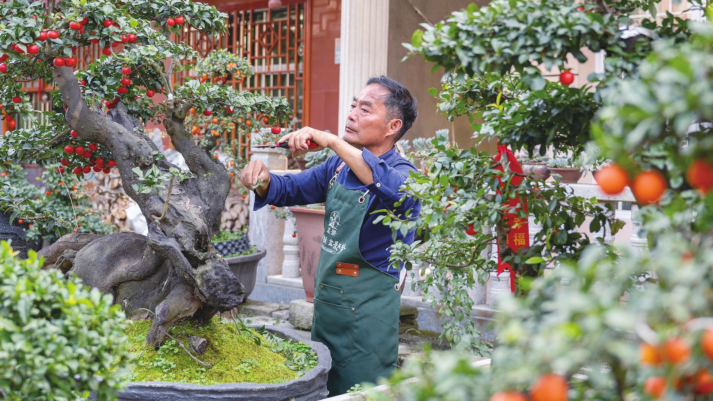 日前,在长阳土家族自治县高家堰镇高家堰村,村民涂常兵在修剪院中盆景。