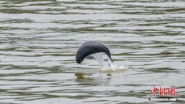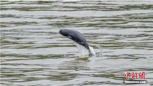 连日来,江豚频频现身长江宜昌段庙嘴等水域,它们时而跃出水面,时而逐浪而行。图为江豚跃出水面。 赵明 摄