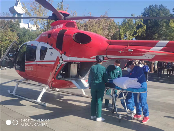 上午10时10分,直升机降落在宜都市陆逊广场,专家立即前往重症监护室对患者进一步进行病情评估。并将患者迅速转运至直升机上。经两地院前急救人的通力合作,高效率的完成了转运和乘机交接,直升机跨过312公里的山川、湖泊与河流,平安降落在武汉亚心总医院,通过急救绿色通道直接将病人送达手术室。