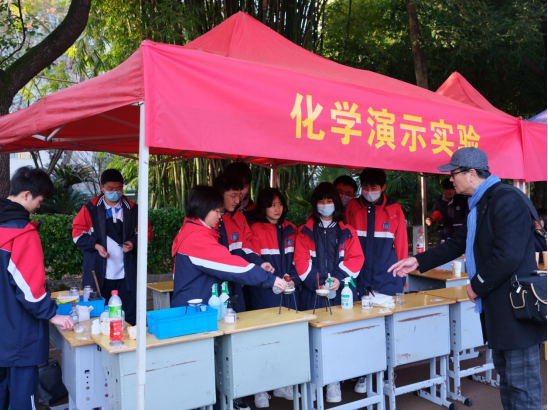 此次科技节共有物理、化学等17个学科科创展区:潜艇模型、乒乓球发球机、机甲对抗车、党建文创音响、火焰检测金属离子、化学板炮、细菌生态模型等等,林林总总,精彩纷呈。