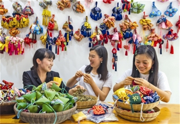 民间艺人在秭归县非遗小院制作艾叶香囊。新华社发(郑家裕 摄)