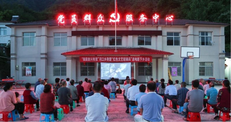 6月14日,荆楚“红色文艺轻骑兵”河口乡小分队走进樟树村,开展“强国复兴有我”送电影下乡活动。