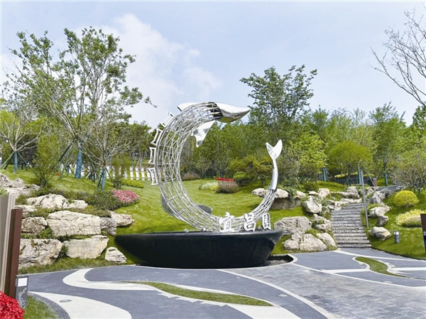 园区入口处,耸立着一座高4.9米、宽5米的中华鲟主题雕塑,基座融入宜昌码头文化,打造成船头样式,结合自然面青石板的水波纹及鲟鱼形状的嵌草铺装,在营造出“长风破浪会有时”豪迈感的同时,也展现了宜昌丰富的自然资源和优越的生态环境。 入园步道两边的景观石是宜昌的特产——西陵石,两边郁郁葱葱的乡土植物,象征着宜昌保护长江的美好期许。利用新材料、新工艺对挡墙做法加以优化,宜昌园经典复刻三峡双线五级船闸,让游客近距离感受三峡工程的壮美。 宜昌园通过优化石笼挡墙做法,复刻三峡大坝,植入重力感应装置和雾森系统,游客走近能感受扑面而来的水雾,身临其境般体验三峡大坝泄洪时的壮丽景观。鲜花覆盖的“上岸渔船”,展示了宜昌保护长江母亲河的成果。