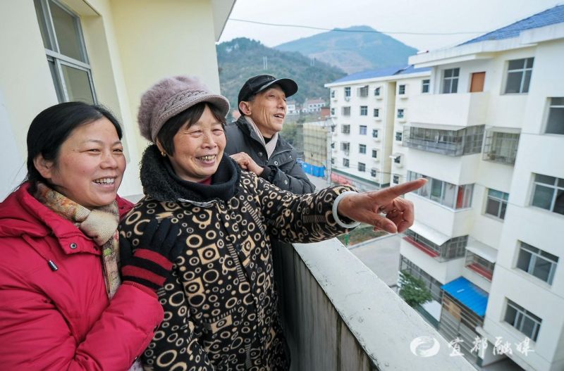 ▲2016年1月19日,松宜矿区的矿工家属丰登香(中)搬进了位于松木坪镇新建成的太平小区的新家,她和邻居们在自家的阳台上观看外面风景。