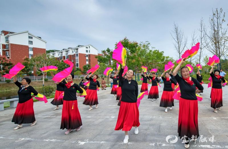 ▲2022年9月22日,居住在松宜矿区新建成的枝城赤溪河小区的矿工家属们,跳起欢快的扇子舞,喜迎党的二十大,满满的幸福感洋溢。
