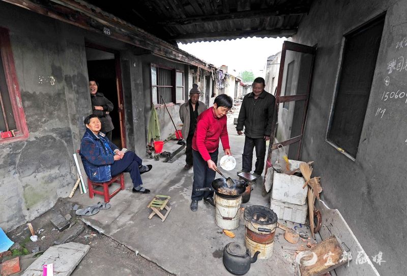 ▲在松宜矿区官渡坪棚户区居住了几十年的矿工和家属们即将迁入新居,他们聚在一起做最后一顿饭(2014年4月20日拍摄)