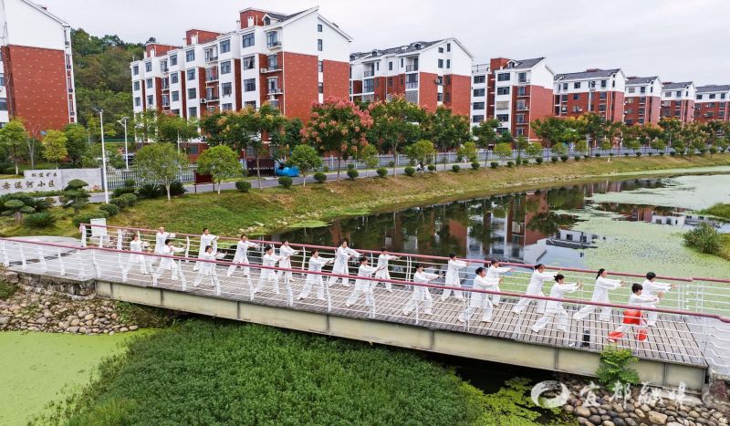 ▲2022年9月22日,入住新居的松宜矿区的老矿工和家属们在环境优美的小区里打太极拳。