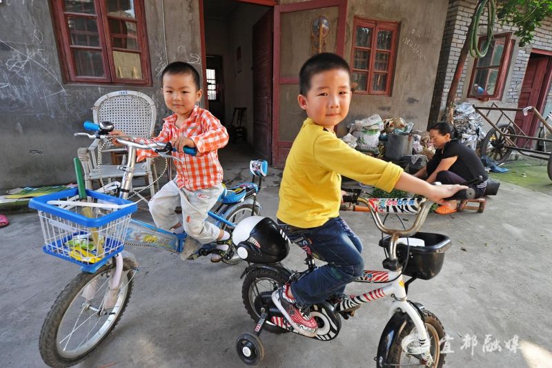 ▲矿工子女周正毅(右)和刘屿周(左)在官渡坪安置小区里玩耍(2014年4月20日拍摄)
