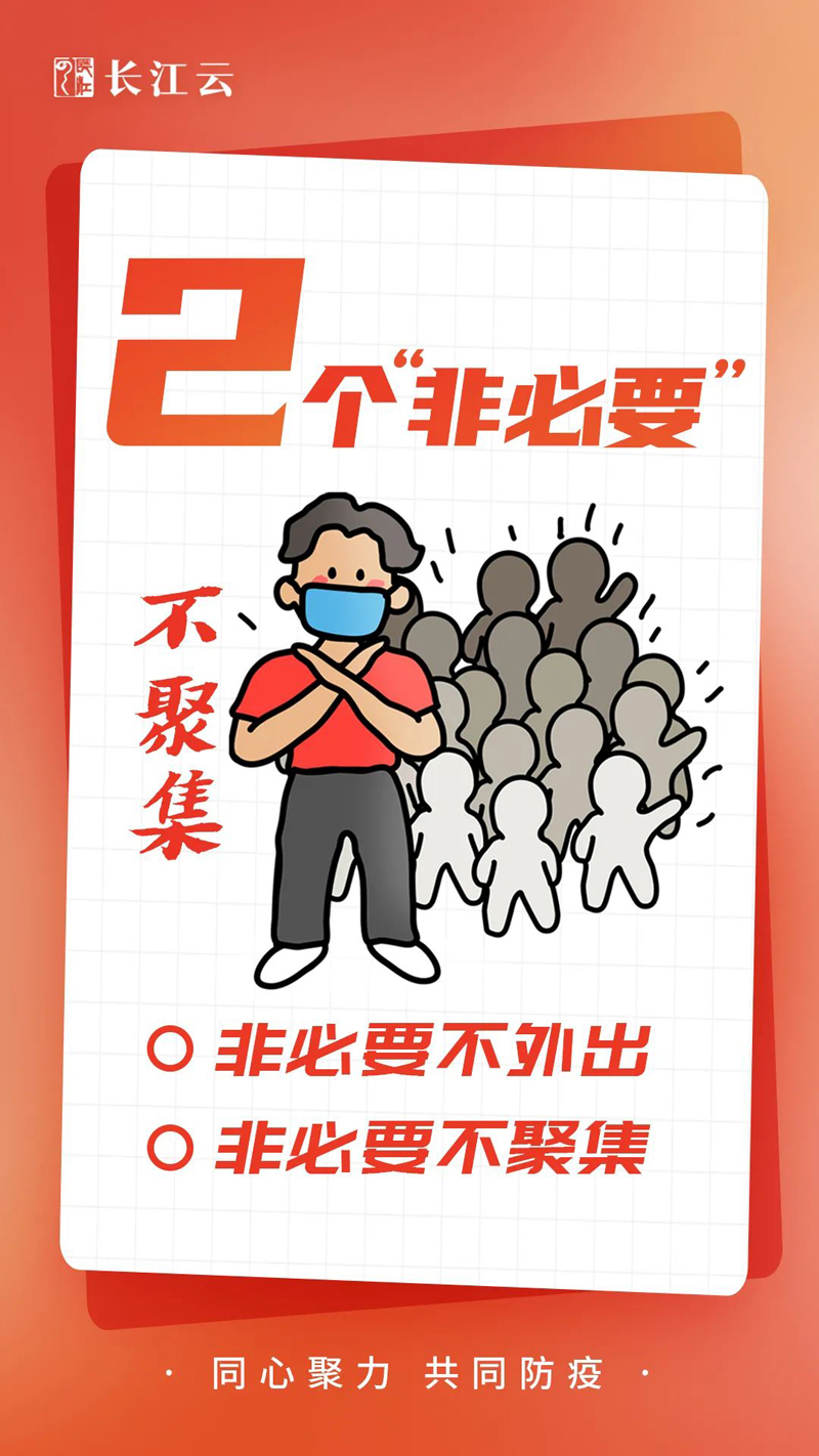 为保护您和家人身体健康,尽快切断病毒传播链条,恢复正常生产生活,请大家非必要不外出、非必要不聚集,筑牢疫情防线。