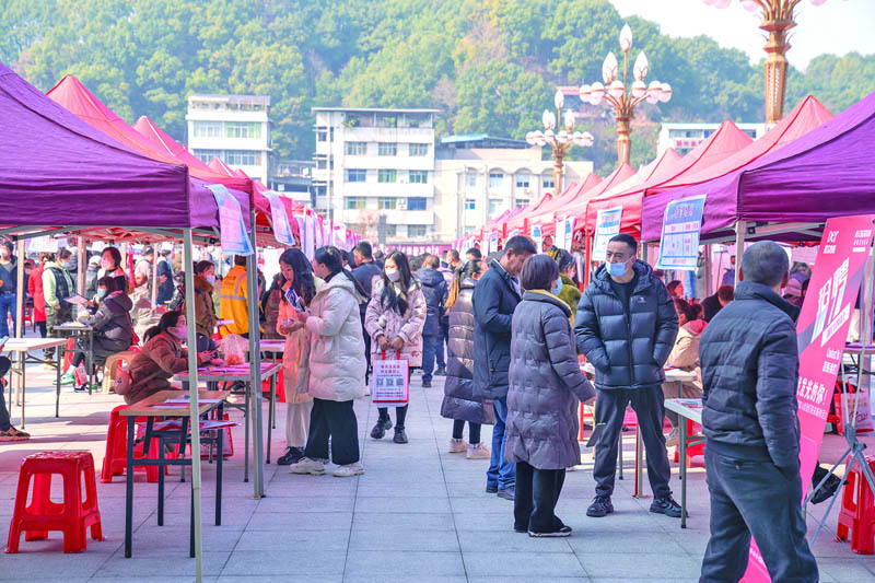 恩施州人社部门广泛征集恩施高新区、各县市园区企业岗位信息,并将征集到的岗位信息汇编成册,通过招聘会、人力资源市场、零工驿站、驻村尖刀班、报纸、电视、短视频、短信等媒介进行宣传,将岗位送到农民工手中。春节前后,“园区企业在招人”这一消息在全州8县市各乡镇广泛传播,“就近务工”的念头在人们心头持续发酵。