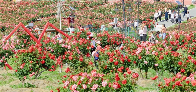 走进月季园,三五成群的游客漫步在园区内的小道上,聊天、赏花、拍照……远远望去,游人与花海交相辉映,美丽又惬意。“从4月29日起,我们景区的游客量迎来了近三年以来之最,4月30日当天接待游客在1.5万人左右。”圣境花谷运营中心经理肖映峰告诉记者,每年的“五一”假期是花谷月季花最佳的开放时节,也是最好的赏花时机。