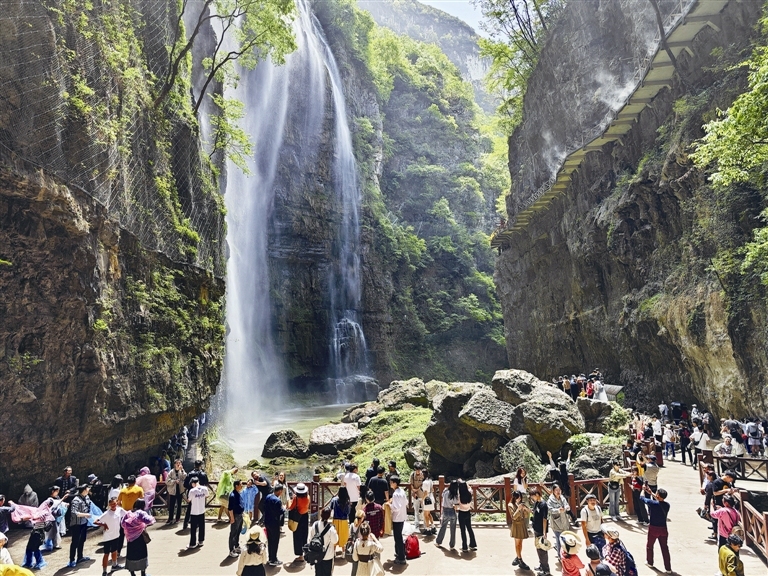 游客在焕新升级的三峡大瀑布景区体验“穿瀑”。三峡大瀑布景区 供图