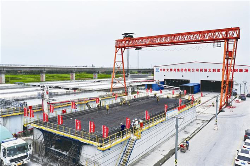 荆荆铁路3标项目最后一榀箱梁完成浇筑。至此,由中铁大桥局承建的荆荆铁路3标项目制梁场圆满完成538榀制梁任务,比预计时间提前了近1个月时间。 荆州日报 供图