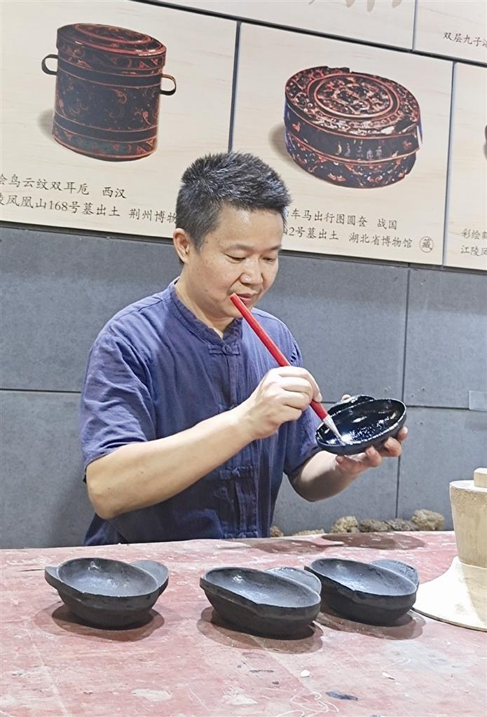 楚式漆器第四代传人、楚式漆器髹饰技艺省级非遗代表性传承人邹传志在荆州市2023年文化和自然遗产日非遗宣传活动中向市民展示髹漆技艺。 邹传志 供图