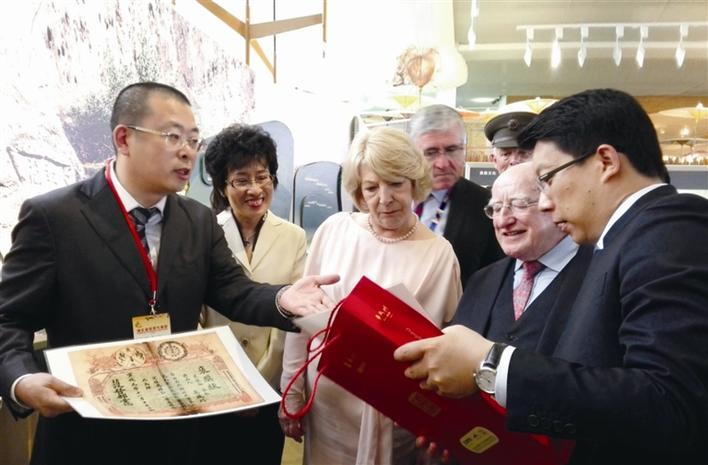 2015年6月长盛川青砖茶第十九代传人何建刚(左一)向爱尔兰总统希金斯(右二)赠送砖茶。 刘锦程 摄