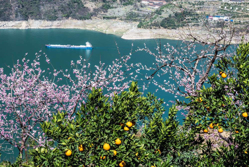 2023年3月13日,船舶从宜昌市秭归县西陵峡村桃花盛开的脐橙果园前驶过。新华社发(郑家裕 摄)
