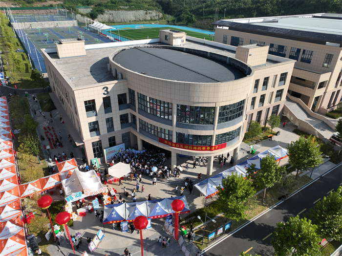 校园内,教学楼鳞次栉比,设施设备一应俱全,绿化环境清幽静谧;报到区、休息区、咨询点有序排列;学生进入报到区后手机一键扫码即可完成所有报到手续,方便快捷。