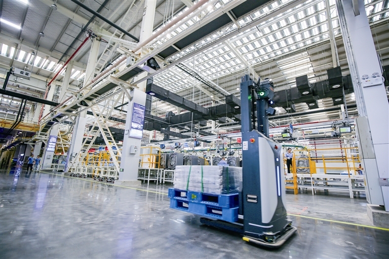 在美的洗衣机荆州产业园零部件物流区域,智能AGV机器人根据产线需要,自动到货架上找货、配货,确保生产线零部件供给不积压、不断档。 荆州日报 供图