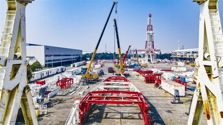 10月24日,中石化四机石油机械有限公司油气总装试验场吊车林立、机器轰鸣,一片忙碌景象。该公司自主研发制造的8000米超深井钻机正进入井架起升环节,预计11月中旬完工。荆州日报 供图