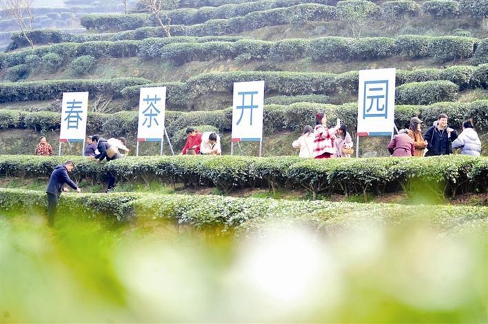 在海拔200米高的茶园内,一排排错落有致的茶树顺着山势绵延起伏,抽芽吐绿,生机盎然。茶农们挎着竹篓,穿行在茶垄间忙着“掐嫩取鲜”。