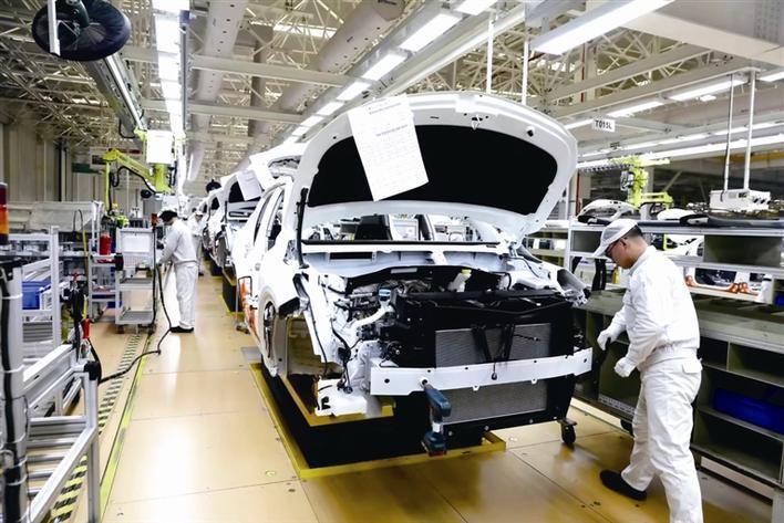 在精诚工科汽车零部件(荆门)有限公司生产车间,放眼望去,成排机械手臂像做健身操一样,做出高举、伸展、转向、低头、平移等动作。操作台上工人们有条不紊地配合,汽车零部件顺利输出。公司经营管理科科长马铮说:“2023年公司实现产值17.3亿元,去7月起月产能达1万台套。”