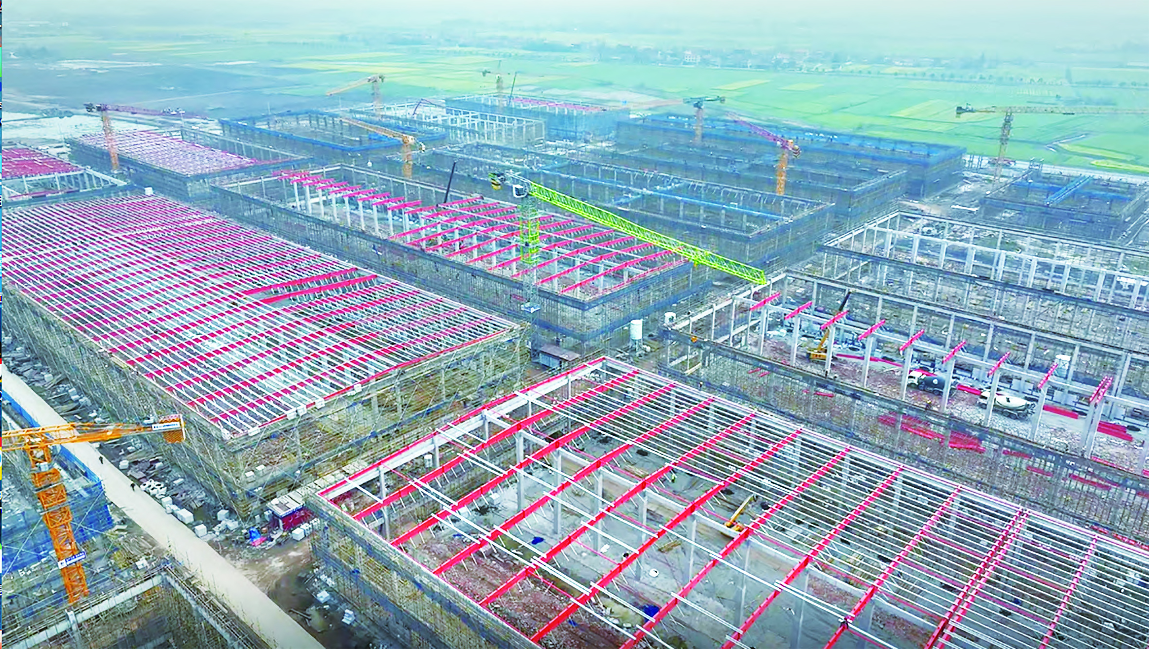 荆州经开区湖北先导电子信息产业园内,35栋单体建筑拔节生长,千余名工人施工正酣,为6月份投产拼抢工期;