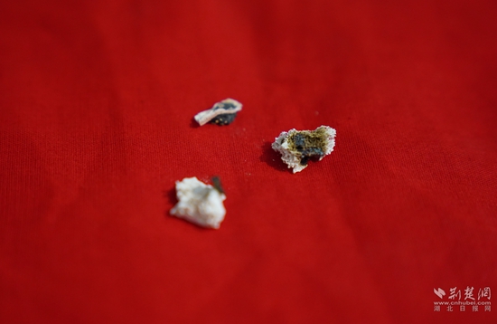 “这几枚小小的弹片,是父亲的功勋证明!”望着嵌入骨头里的弹片晶体,高水莲啜泣道。家人一边安慰高水莲,一边收起弹片晶体,并用红绸将其包裹起来。