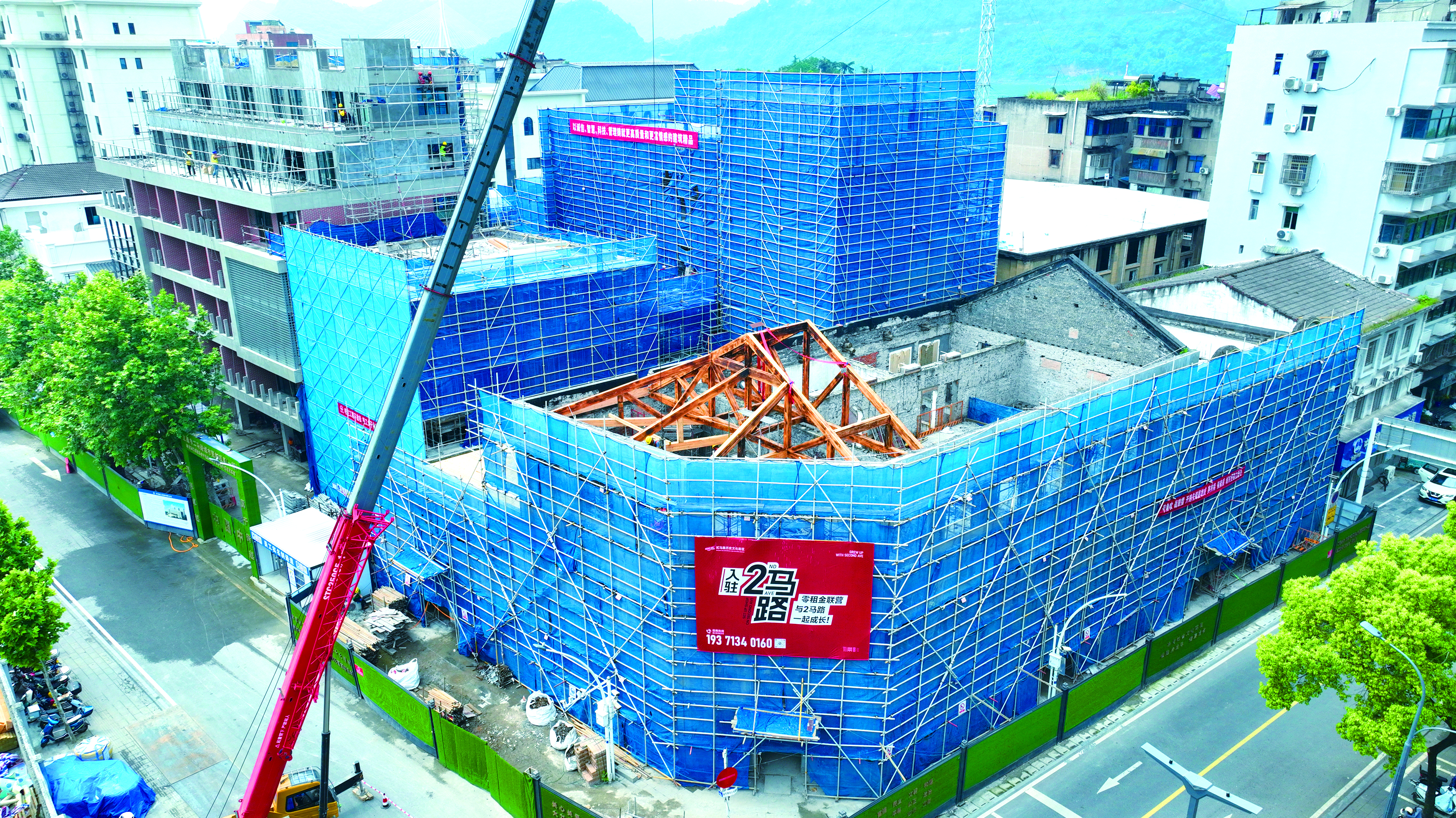 5月9日,位于宜昌城区二马路与红星路交会处的满意楼迎来了重要的修复工程——木质房梁的安装。(记者林潇 摄)