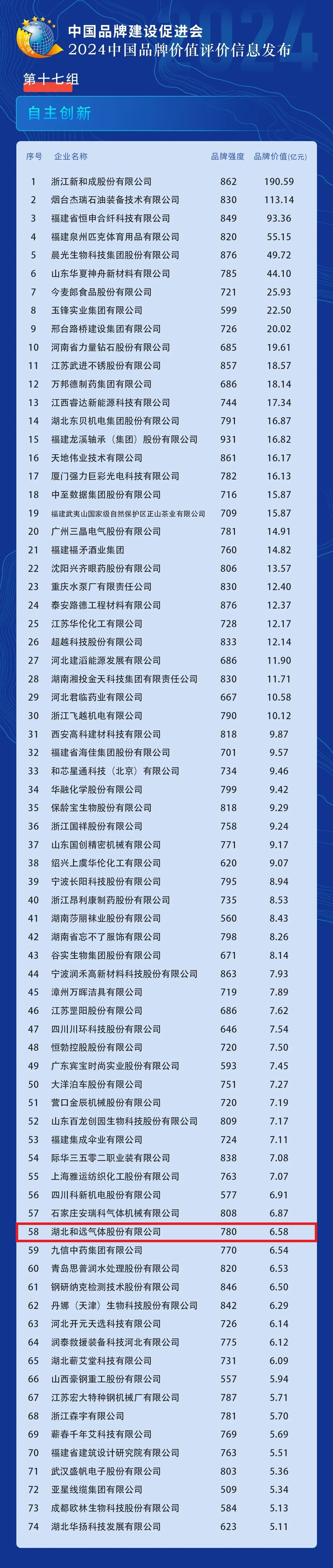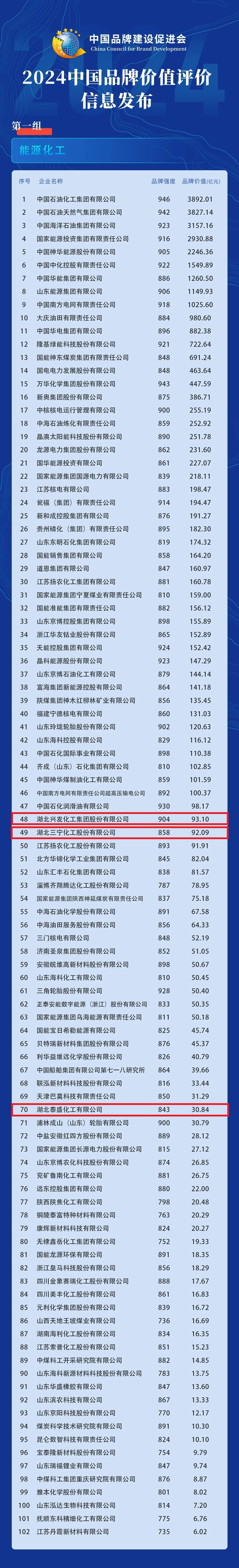 今年参加评价的品牌数量达到1034个,涵盖全国大部分行业的龙头企业。本次对其中775个品牌进行了品牌价值评价信息发布,发布总品牌价值为125858亿元。在此次发布的榜单中,宜昌上榜数较去年增加3个,其中,湖北兴发化工集团股份有限公司、宜昌人福药业有限责任公司品牌价值较去年分别提升47.94%和20.98%,湖北泰盛化工有限公司和湖北和远气体股份有限公司均为首次上榜。(通讯员:邓丹杰)