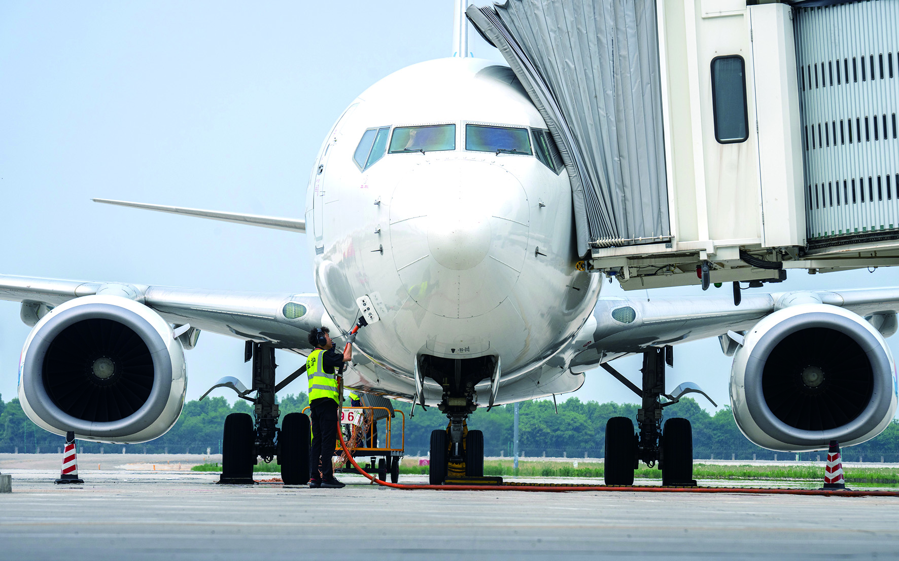 5月22日,湖北宜昌三峡国际机场工作人员为一架到达的客机接入桥载电源。