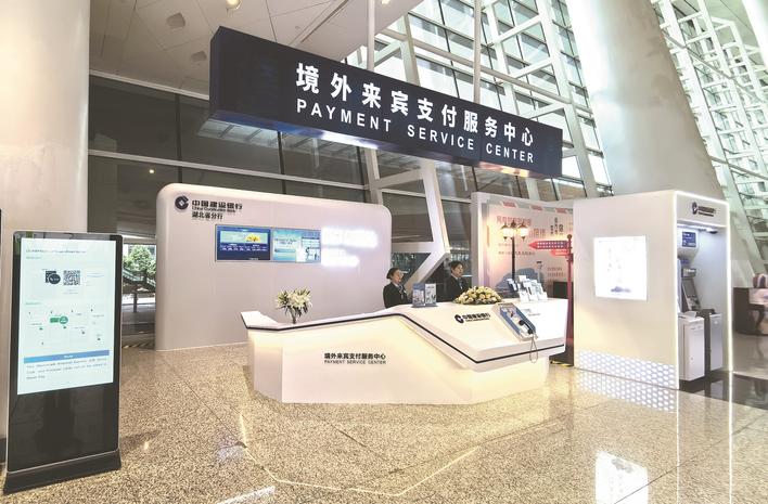 在人民银行湖北省分行统筹建设的武汉天河国际机场境外来宾支付服务中心,境外来宾可办理美元、日元、英镑等12种外币现钞兑换,也可用维萨、万事达等国际卡组织发行的外卡支取100元及10元面额的人民币,中心的承建银行——中国建设银行湖北省分行还配备1名专业人员提供支付服务咨询,帮助境外来宾快速了解掌握在华支付方式,高效获取便捷、多样的支付服务。