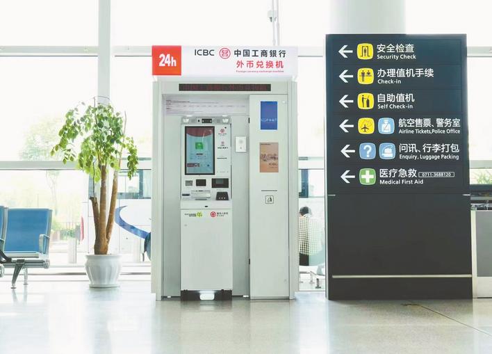 在鄂州花湖国际机场航站楼一楼大厅内,一台外币兑换机分外醒目。这是今年4月,人民银行湖北省分行组织中国工商银行鄂州分行刚刚在这里新设的兑换机,目的是为了服务来此出差住宿的外国客商。