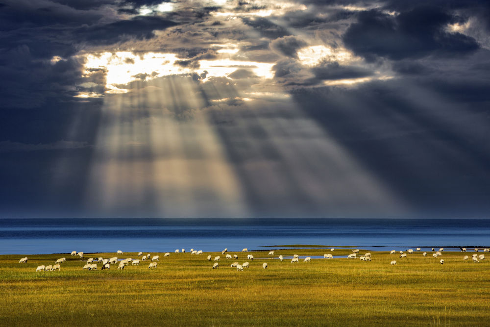 清晨,一道泛着红晕的光从烟波浩渺的湖面徐徐升起,大湖之畔,毡房点点,牛羊满坡,野花绽放。
