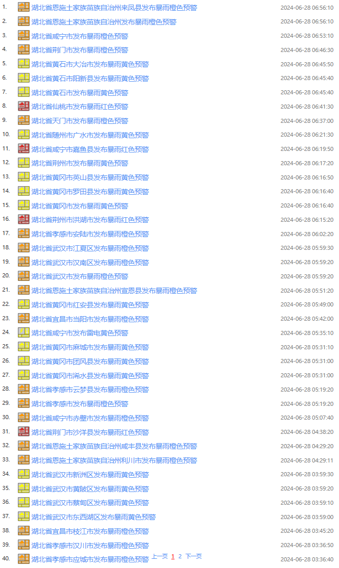 武汉中心气象台2024年06月28日07时09分发布暴雨橙色预警:预计28日08时至29日08时,恩施南部、宜昌东部、荆门东部、荆州、天门、潜江、仙桃、随州东部、孝感、武汉、黄冈、鄂州、黄石北部、咸宁北部等地将有暴雨到大暴雨,请注意防范。