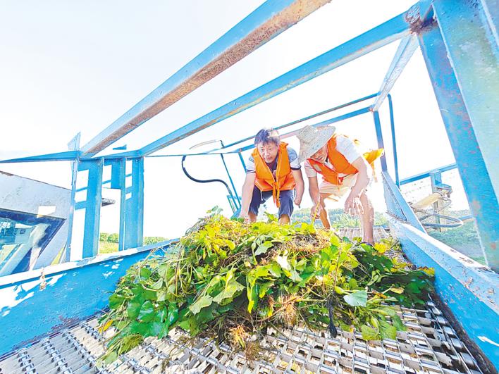 只见吴远志熟练地跳上船,随后蹲下身子,左臂撑在船面上,右手麻利地从船舱里拖出清漂叉、铲子、钉耙等工具。随后,他打开驾驶室门,启动清漂船搜索水面。