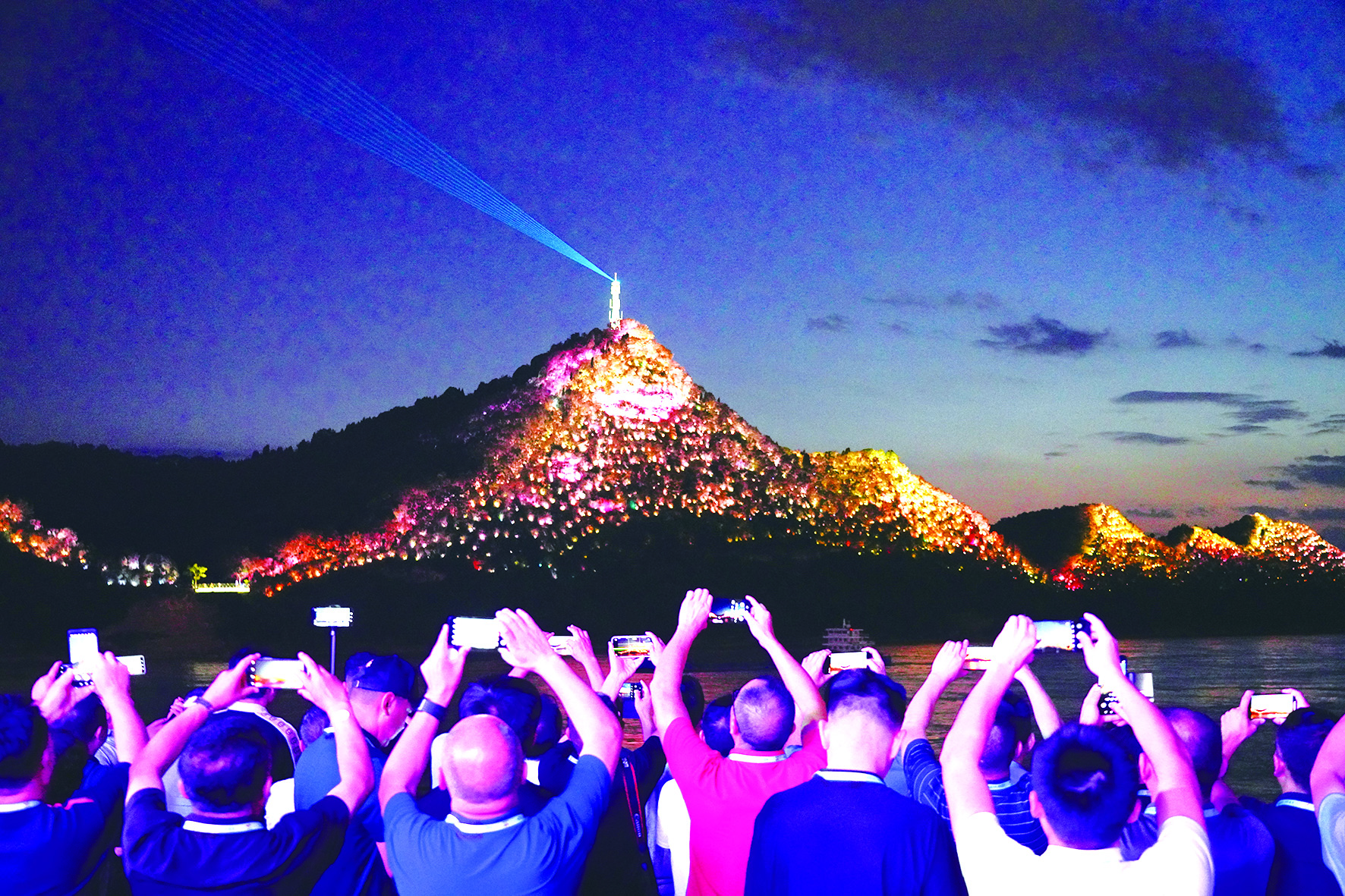 参加百家党媒看三峡主题采访活动的嘉宾们体验长江夜游,拍照打卡磨基山夜景。 湖北三峡文旅集团供图