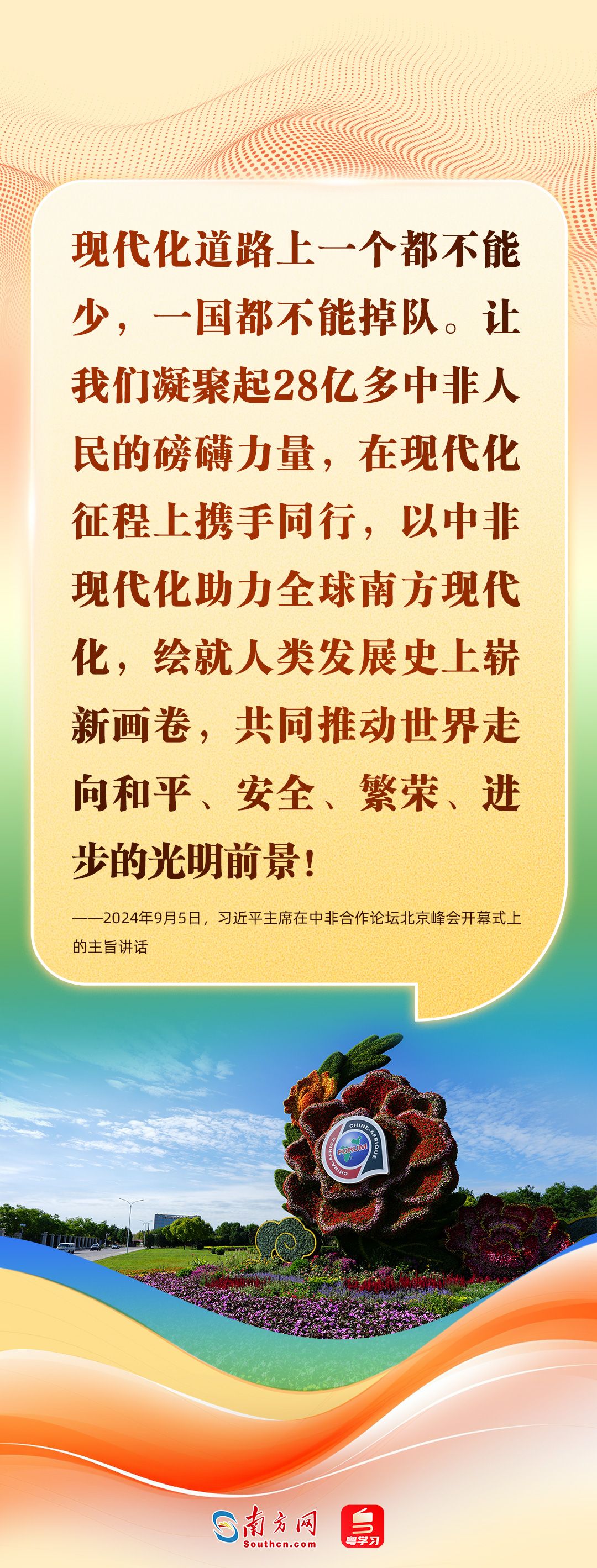9月5日,中非合作论坛北京峰会开幕式举行,习近平主席发表了主旨讲话。习近平主席宣布,中国同所有非洲建交国的双边关系提升到战略关系层面,中非关系整体定位提升至新时代全天候中非命运共同体,将实施中非携手推进现代化十大伙伴行动。