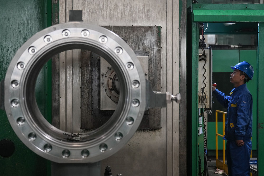 2024年1月11日,工人在大连华锐船用曲轴有限公司加工车间加工产品。新华社记者 潘昱龙 摄