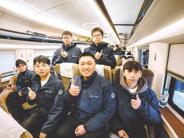 荆荆高铁建设者乘坐首发列车。(记者田悦摄)