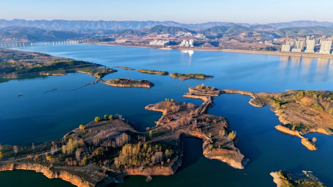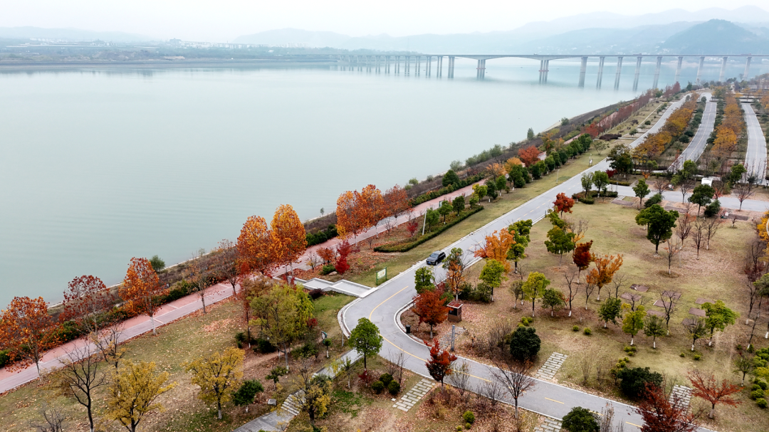 初冬时节,郧阳段库滨带五彩缤纷、景美如画。