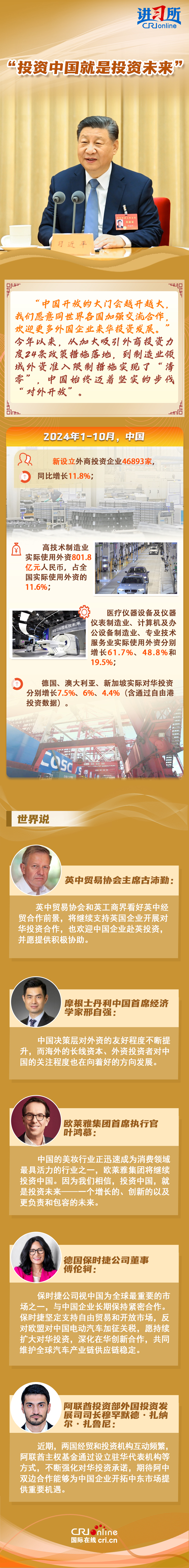 “中国是实干家、行动派。”今年以来,从习近平主席的欧洲之行到拉美之行,再到四天前在北京会见主要国际经济组织负责人,习近平一直强调,中国的发展将给世界带来巨大机遇。据联合国贸易和发展会议不久前发布的《世界投资报告2024》中文版显示,中国吸引外资的结构不断优化、质量不断提高,多位政商界人士也认为中国是一个非常有前景的市场,投资中国就是投资未来。