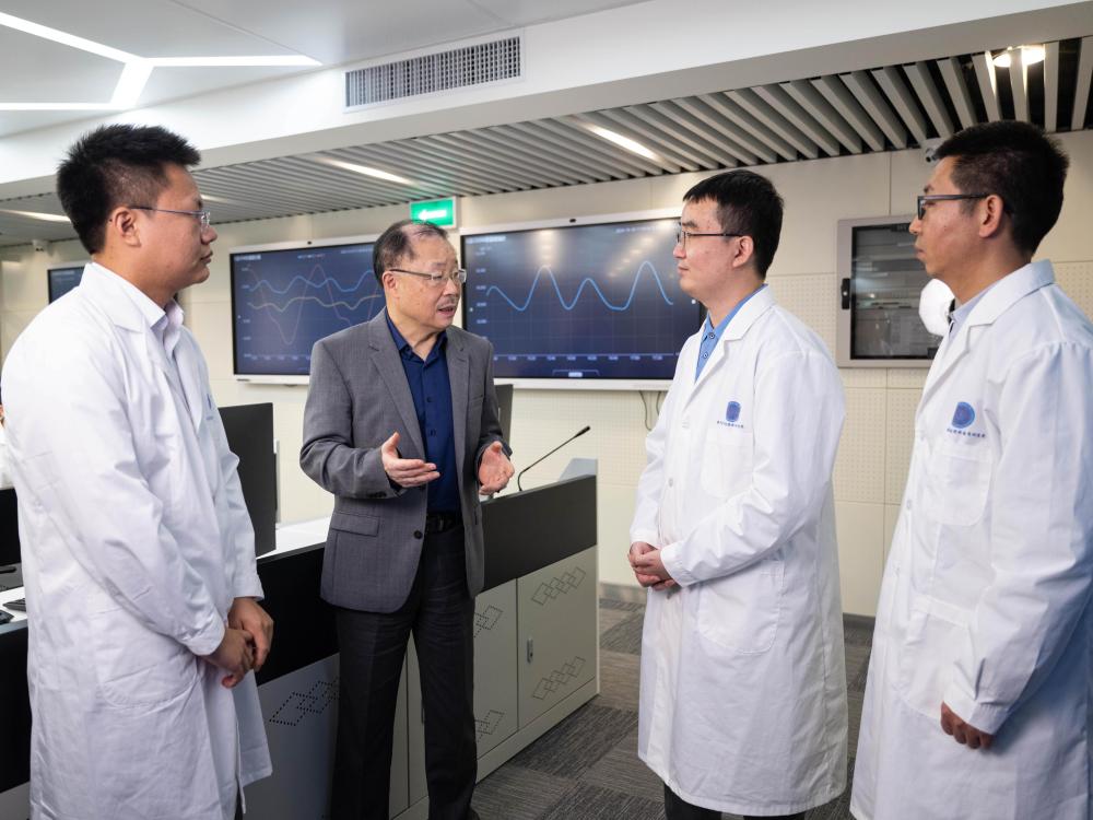12月4日,澳门空间技术与应用研究院院长张可可(左二)和“澳科一号”卫星项目助理研究员尹亮(右二)交流。新华社发(张金加 摄)