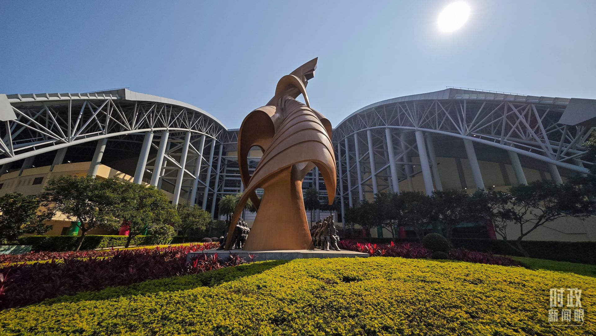 △澳门东亚运动会体育馆前,名为“扬帆”的巨型雕塑熠熠生辉。(总台央视记者彭汉明拍摄)