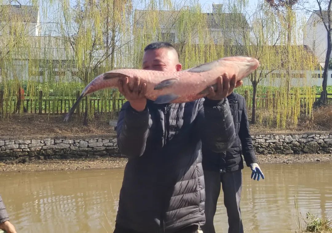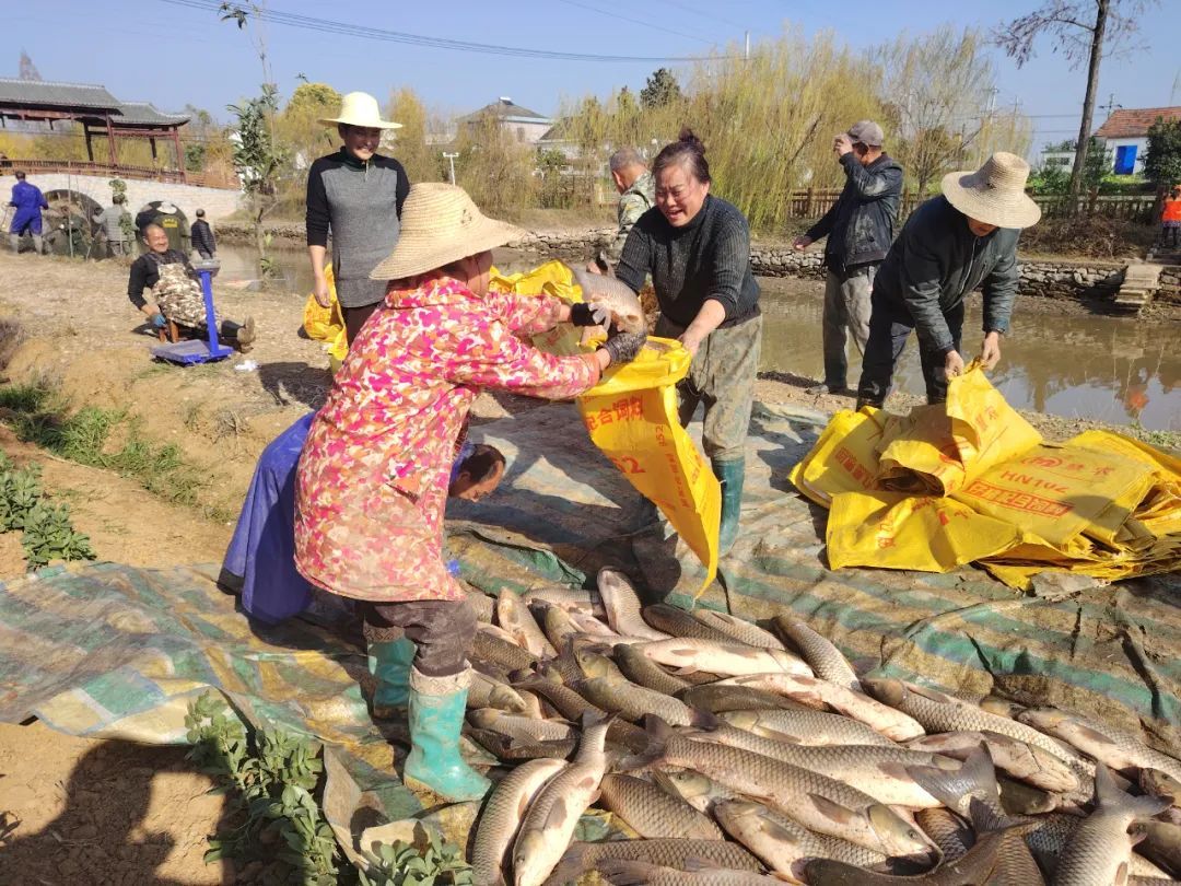 据了解,第一轮共打捞起近5500斤鲜鱼,参与共享鱼塘管理的村民每户可以分到约45斤鱼,后续还会针对个头较小的鱼进行第二轮打捞。“今年预估每户能分50斤左右,收获还是蛮可观的。”组长介绍。