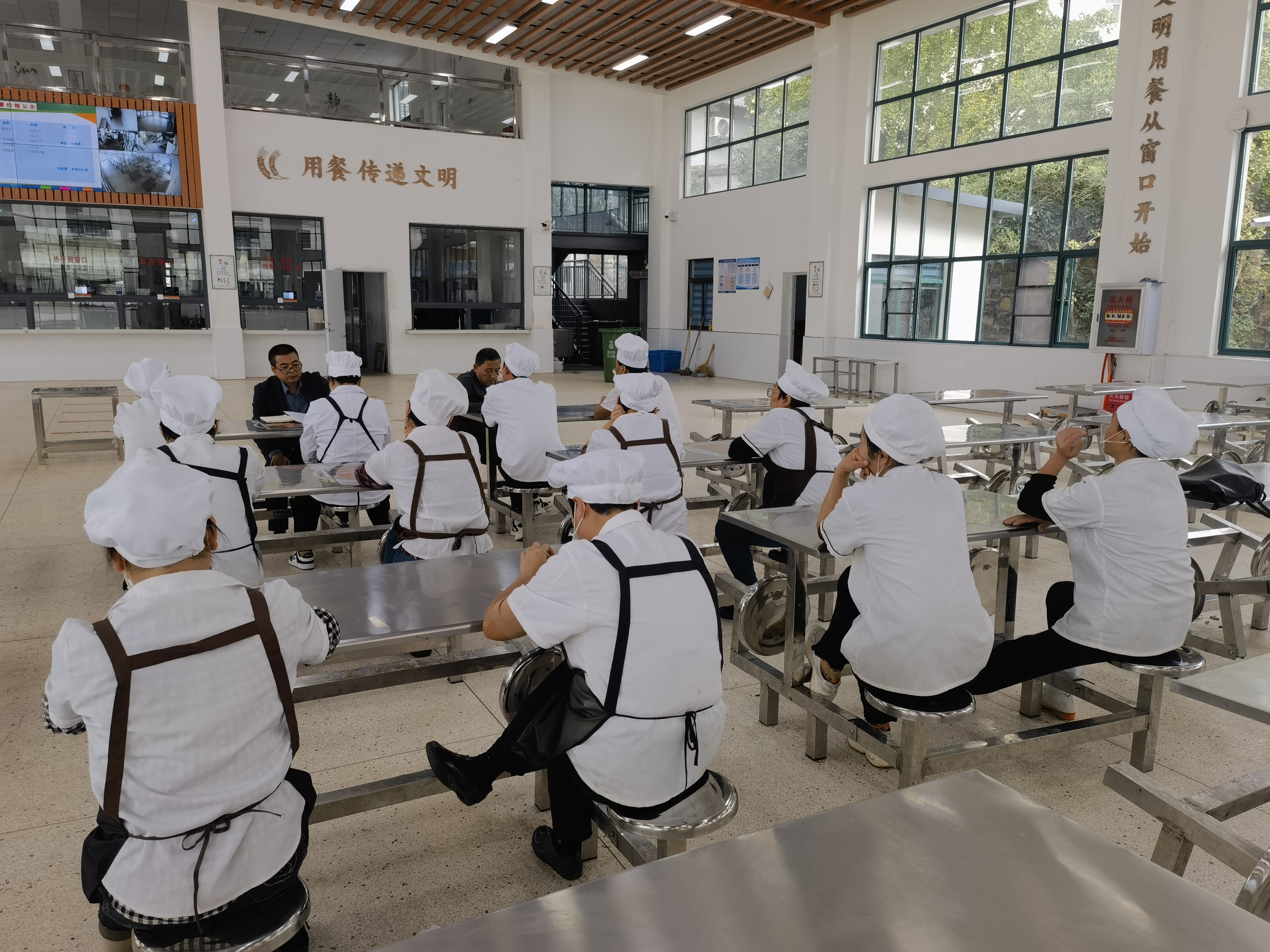 加强宣传培训,提升工作能力。通过班会、食品安全教育课、黑板报等活动,以展板、电子屏等形式,进行全方位、多角度的宣传,营造了人人关心、重视食品安全的氛围。同时,围绕食品安全法律法规、食物中毒调查及应急处理等,系统地培训食堂相关工作人员岗位职责、食品原料采购、贮存、加工、留样操作规程及管理、从业人员个人卫生、食堂布局和工艺流程等知识,提高了学校食堂相关工作人员食品安全责任意识、专业知识水平和岗位操作能力,确保师生“舌尖上的安全”。