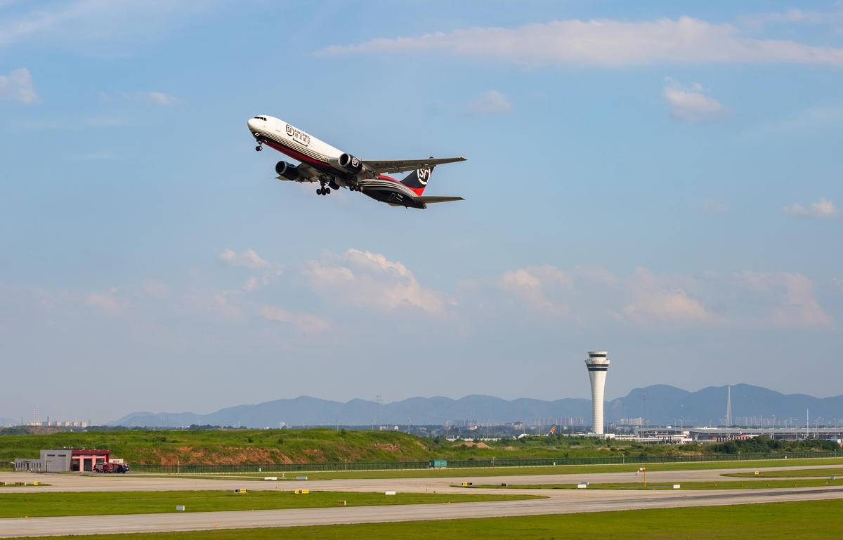 7月5日,一架全货机从鄂州花湖国际机场起飞。(湖北日报全媒记者 薛婷 摄)