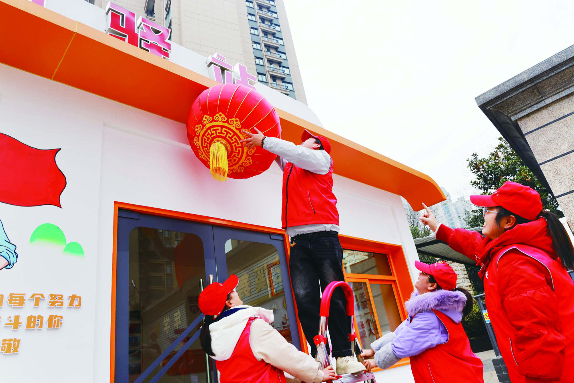 2024年12月31日,伍家岗区花溪路社区“红领驿站”,青年志愿者正在挂大红灯笼。当日,花溪路社区早早就把驿站打扫一新,为户外劳动者放上矿泉水、急救包等物资,红红火火、喜气洋洋迎接新年。(记者黄翔、通讯员黄珺 摄)